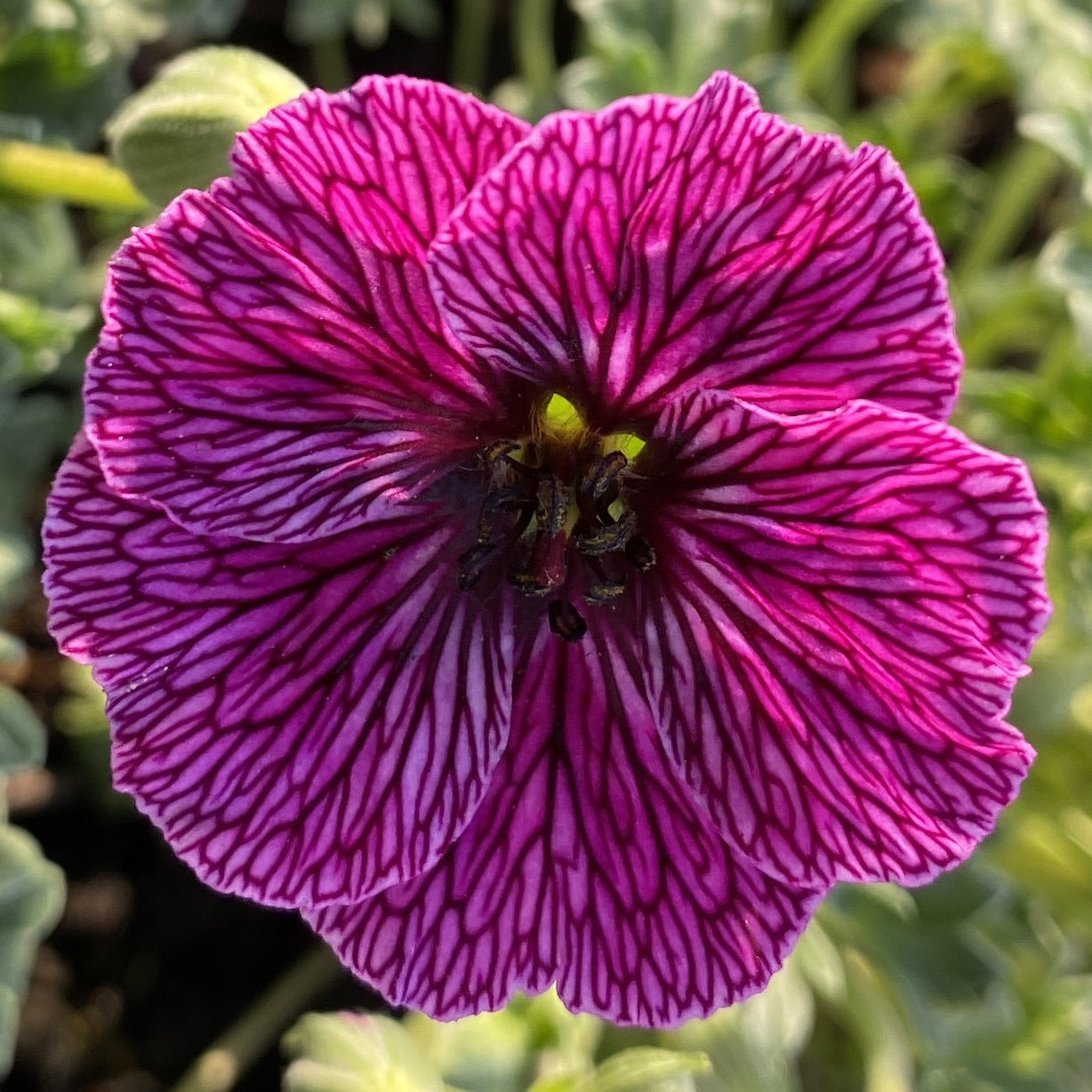 Key Features: Very attractive, deep-lilac veined flowers with a lighter star shape present and a dark centre, held over a compact mound of small, grey-green leaves.