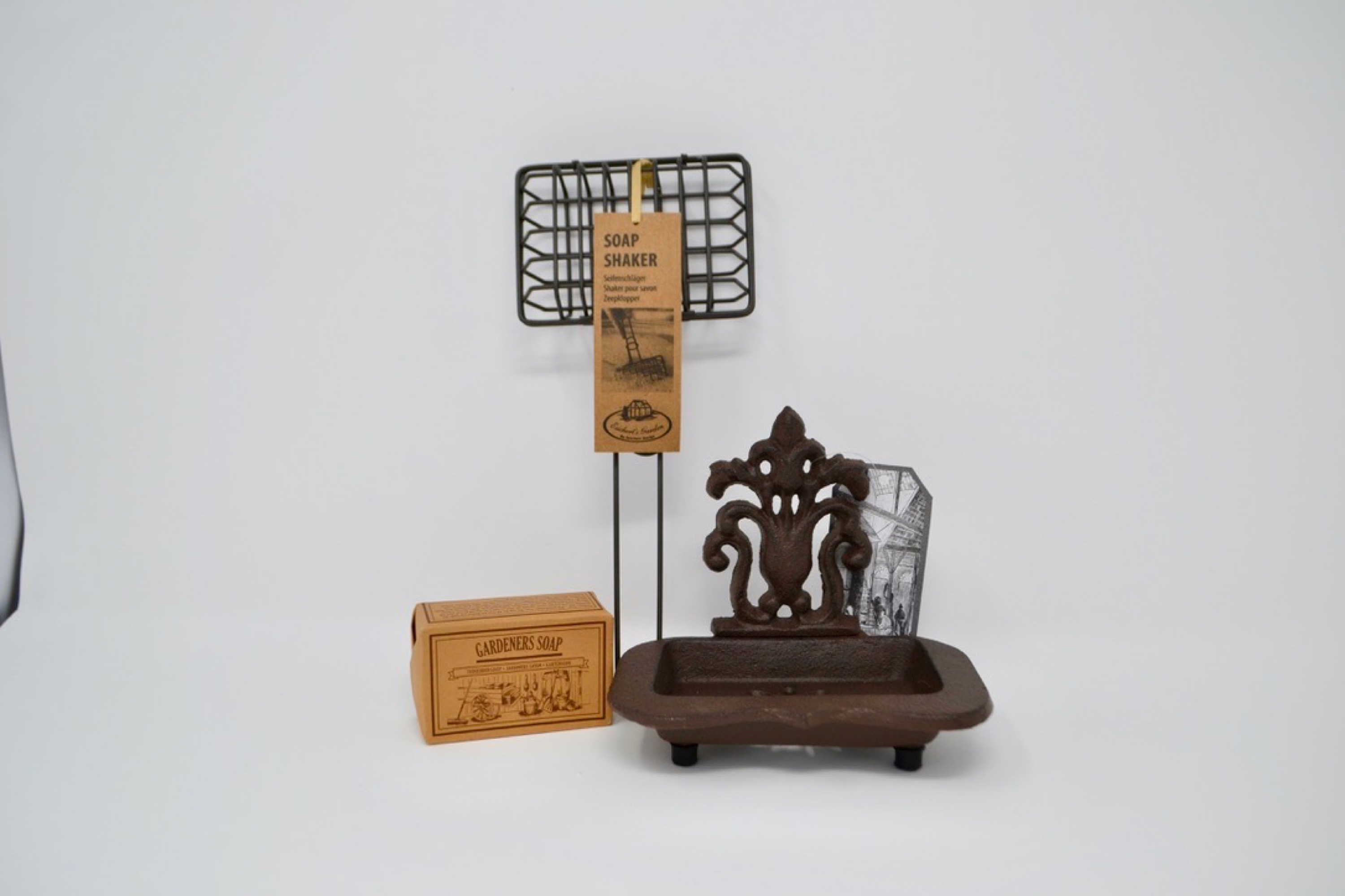 This gift bundle includes a cast iron soap dish, a soap shaker and 2 x Gardener's Soap bars.