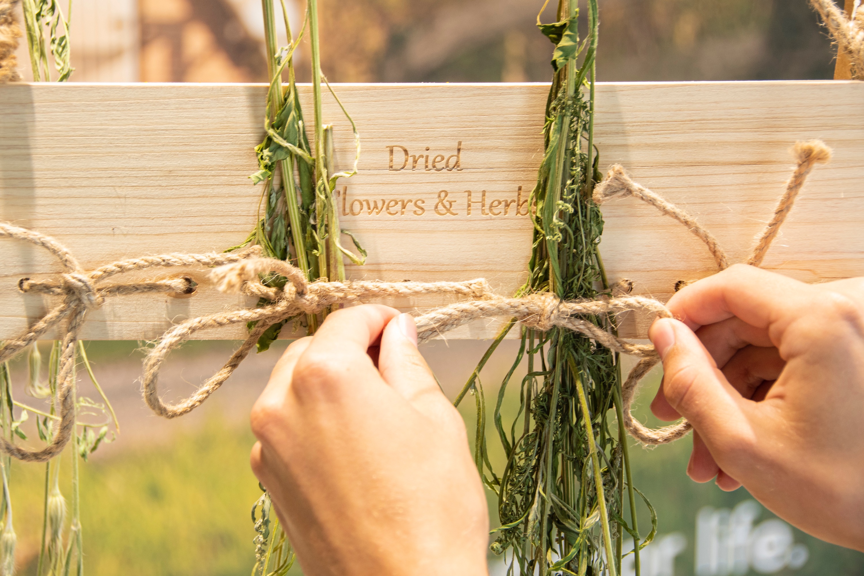 Simply hang the rack on a wall or island overhead, and tie your flowers on with the rope provided.
