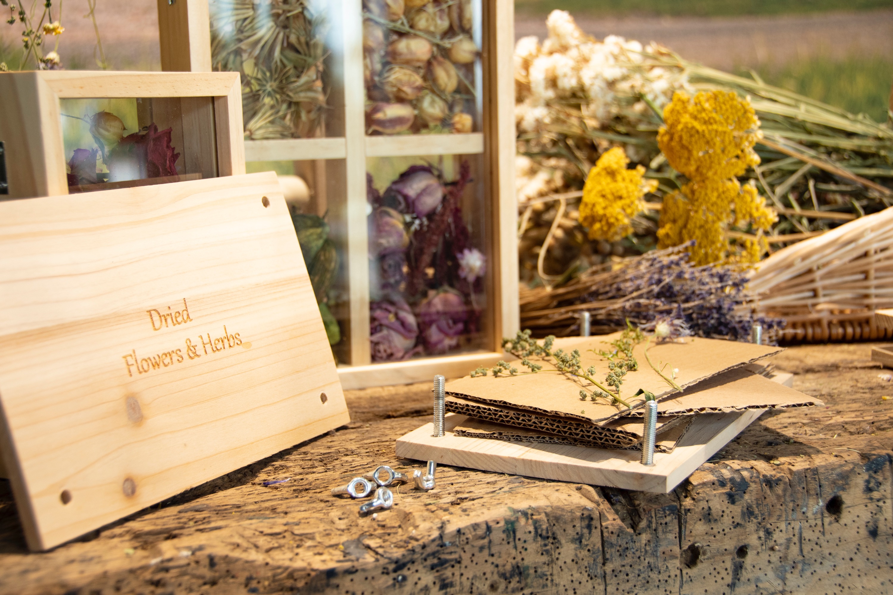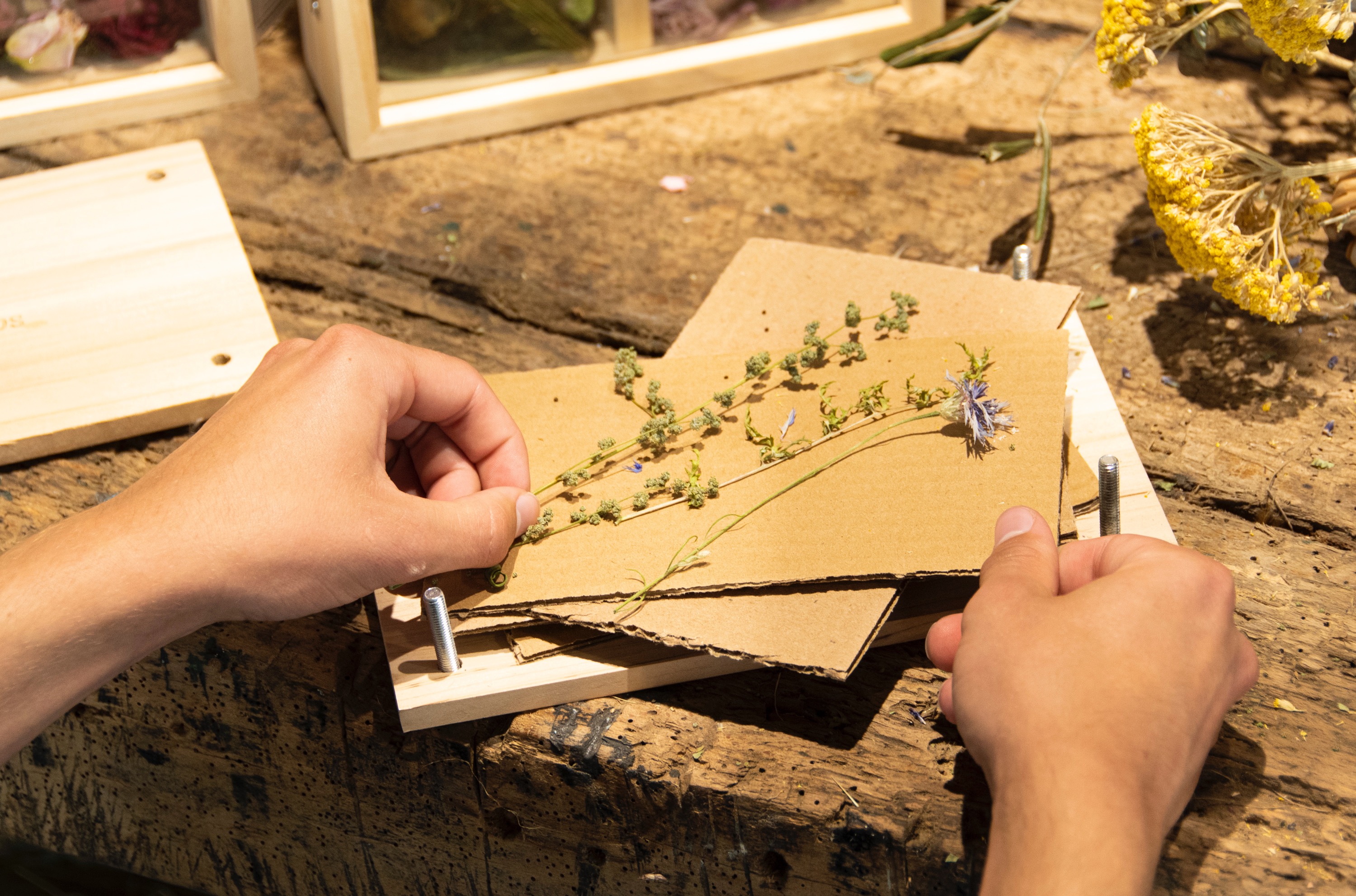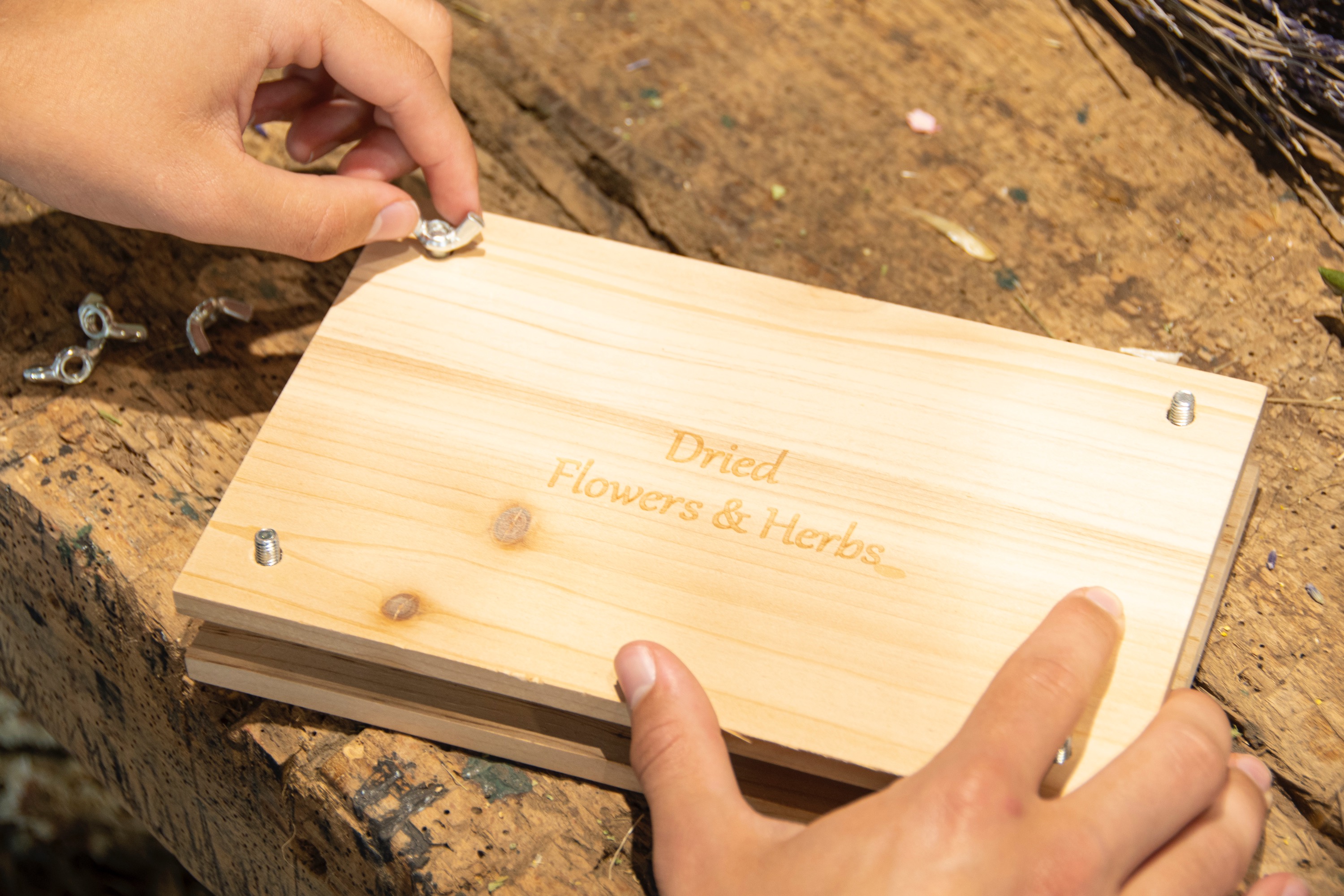 Simply sandwich the flowers on paper in between the cardboard layers in the press, tighten the screws and leave for an adequate amount of time to dry.